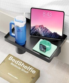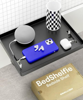 رف BedShelfie CableCatch الأصلي بجانب السرير، رف سرير بطابقين، أساسيات غرفة السكن الجامعي، رف سرير السكن الجامعي، حامل صينية طاولة قابل للتثبيت كما هو موضح في Business Insider (CableCatch، أسود)