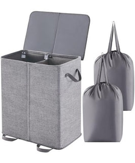 سلة غسيل مزدوجة من لايف ويت مع غطاء وأكياس غسيل قابلة للإزالة، سلة كبيرة قابلة للطي مع مقسمين للملابس المتسخة ومقابض لغرفة النوم، غرفة الغسيل، الخزانة، الحمام، الكلية، لون رمادي